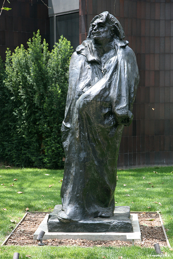 But invading space? One might wonder if my wording is a bit dramatic. In fact, I intend it to be. Rodin, a French sculptor (1840-1917), often times regarded as the predecessor of modern sculpture, challenged the barriers of traditional sculptural relationships to the audience and space. Due to the three dimensional nature of sculpture, particularly of figures, I understand that it is problematic to photograph sculptures in the round. Thus, I have here three images of Rodin’s Monument to Honore de Balzac from three different museums to give a sense of how the sculpture may look in the round.